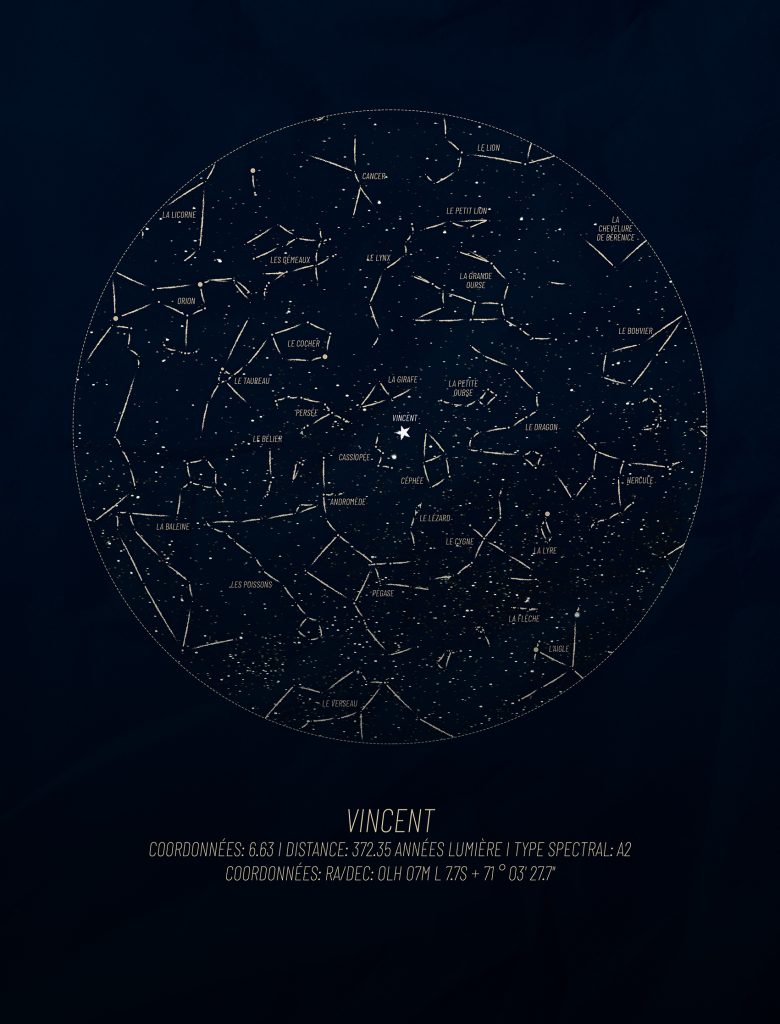 Graphisme, Print Constellations 12/06/2025 / Une affiche du ciel et des constellations, le tout dessiné à la main sur Illustrator. Le but était de pouvoir situer et montrer l’emplacement de l’étoile Vincent.