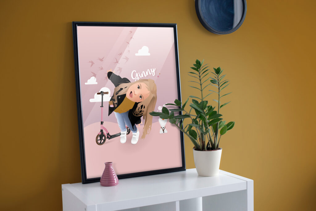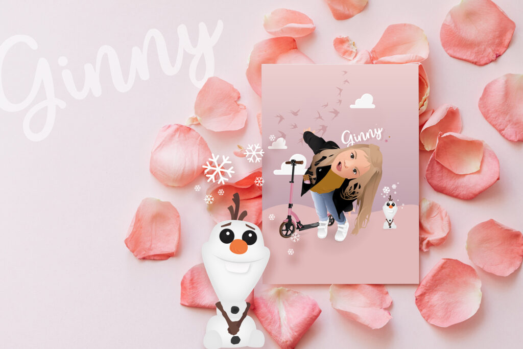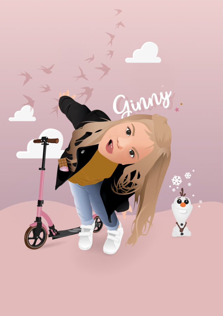 Illustration, Illustration & Dessin, Portrait Vectoriel Ginny & la trottinette 06/03/2022 / Illustration de la petite Ginny et tout ce qu’elle aime : La trottinnette, Olaf, sans oublier le chocolat à portée de main dans sa poche !