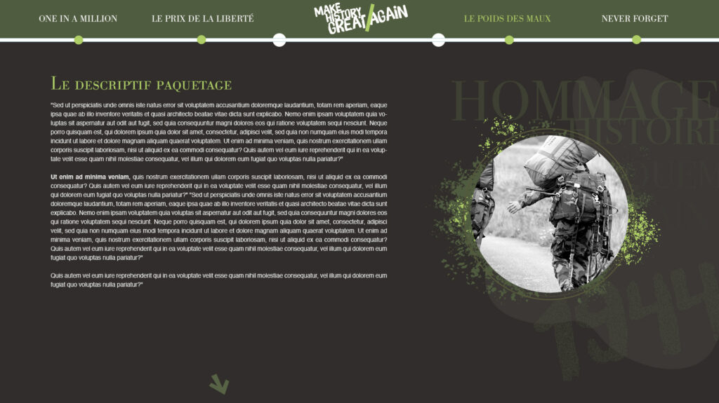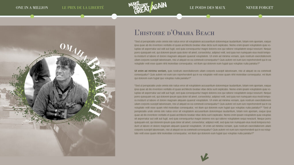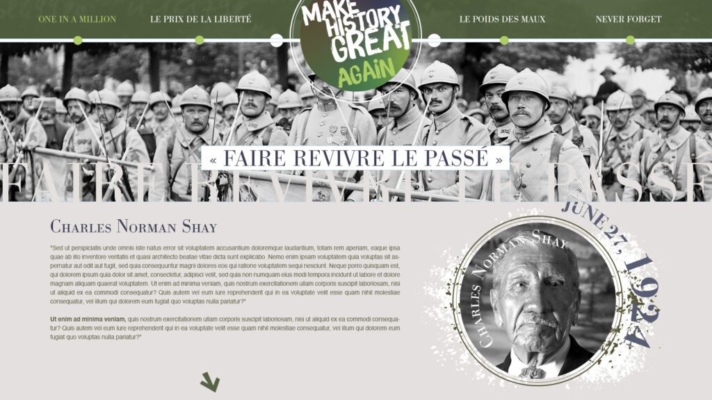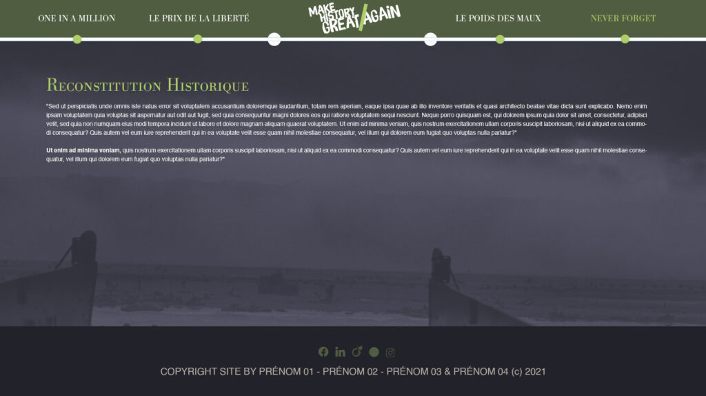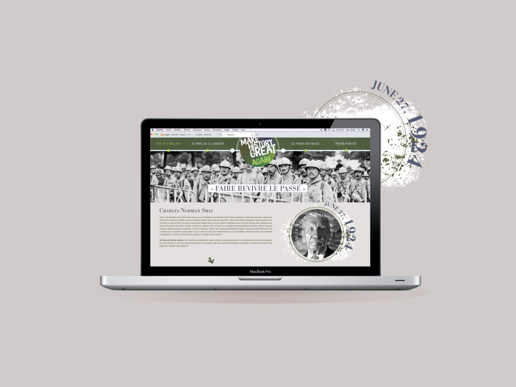 Graphisme, Logotype, Webdesign Make History great again 06/03/2022 / Création d’une maquette de site web. Dans le cadre d’un projet de développeurs web junior, j’ai réalisé cette maquette de site dont l’idée était de ne jamais oublier le passé, et faire revivre notre histoire.
