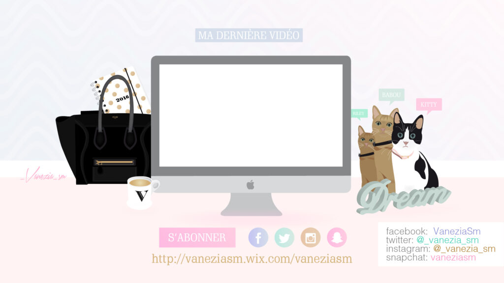 MISSION: Réaliser la bannière ainsi que l’image de fin de vidéo pour la chaîne YouTube de Vanessa. Cette image permet aux internautes de pouvoir directement s’abonner à la chaîne, de voir un extrait de la dernière vidéo publiée ainsi que la possibilité d’accéder aux différents réseaux sociaux.